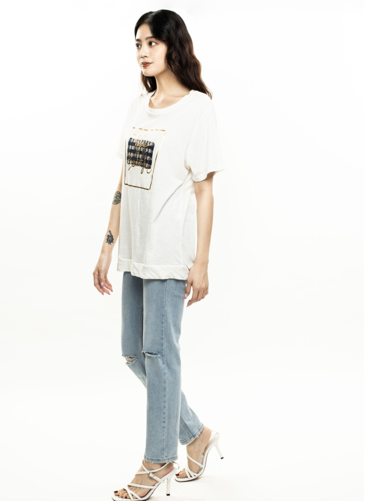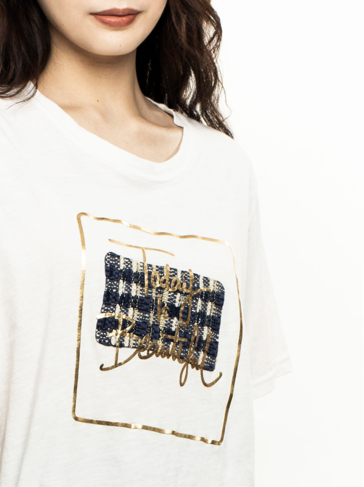 • 小香風美好日常燙金印花T-白