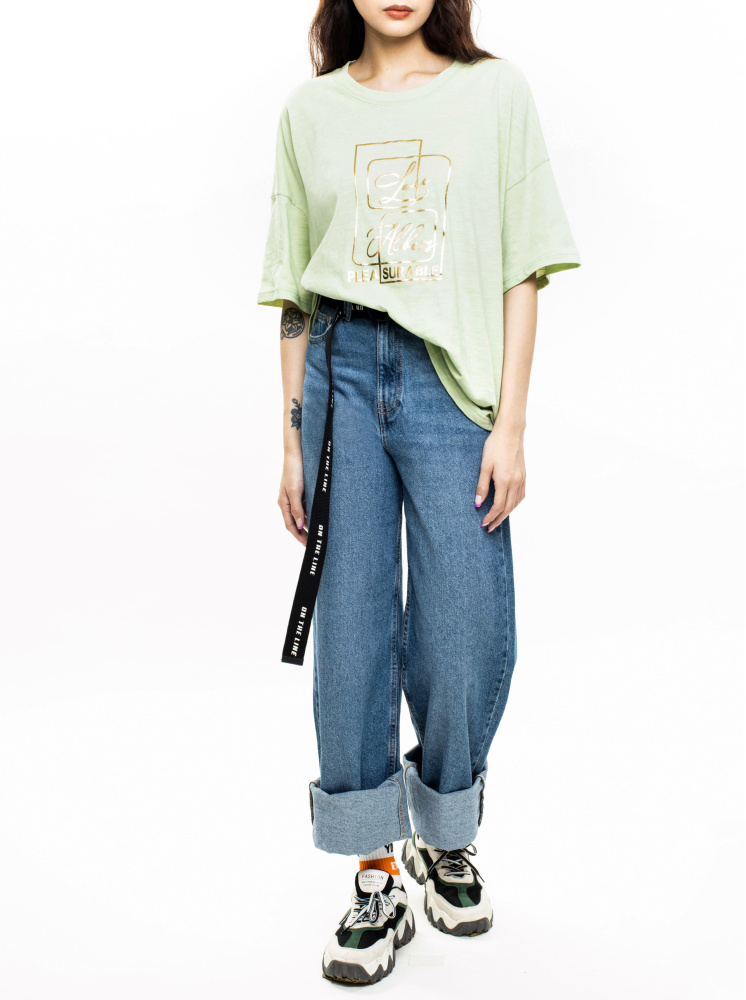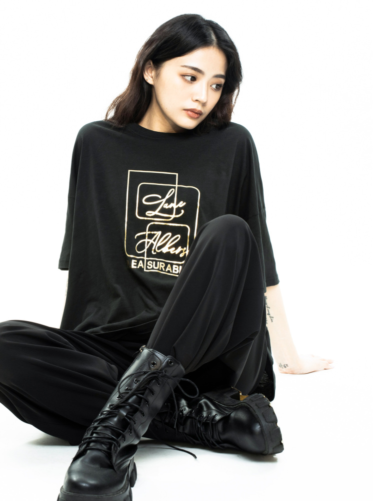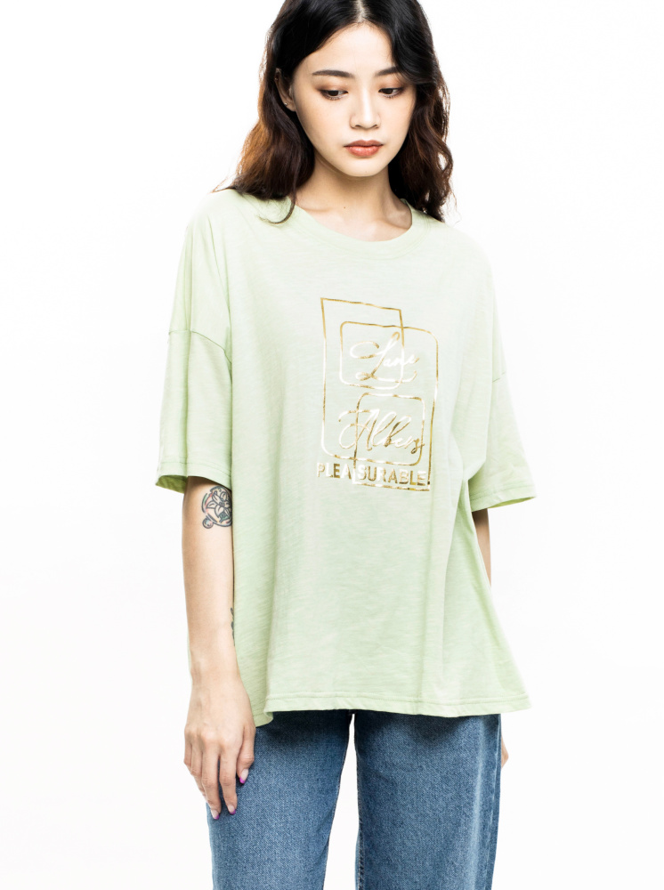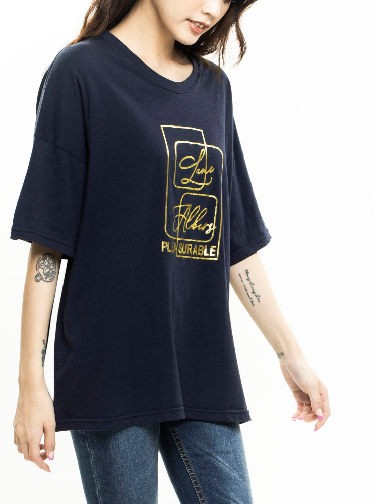 落肩寬鬆燙金男友T-深藍:選擇尺寸